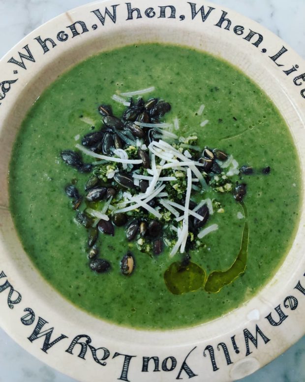 If we're going to boost immunities in our families, we need green soup in our lives! Here is my concoction of leeks, shallots, garlic, spinach, nutmeg, squeeze of 🍋, coconut milk, stock, salt, pepper and for extra love, a spoonful of my homemade pesto. (Blitzed kale, parmesan and pine nuts - children's tea) #feedthefarmer #gogreen #vegshed #shopwell #cookwithlove